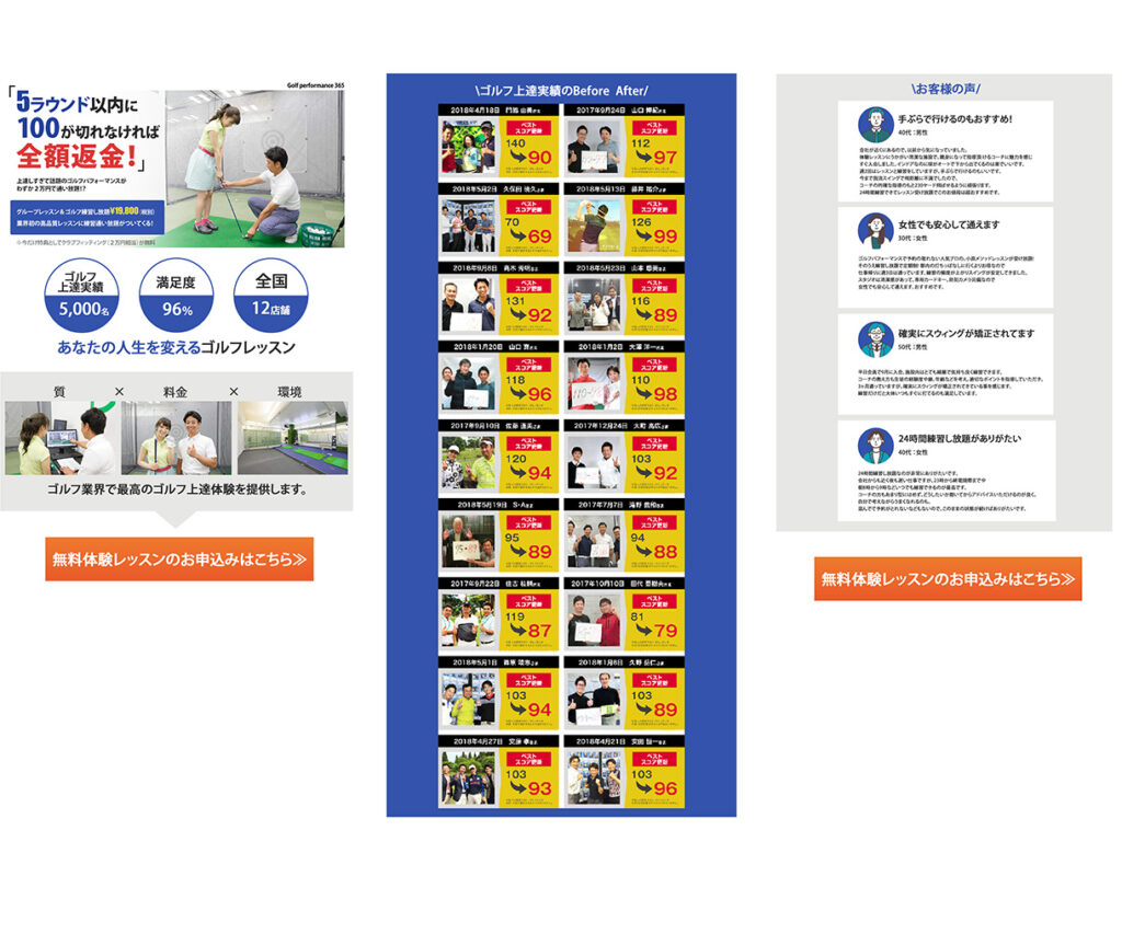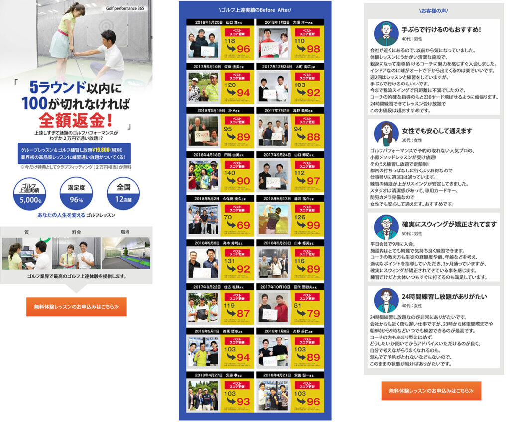 目的: ゴルフ練習スタジオへの誘導。無料体験レッスンからバックエンドオファー